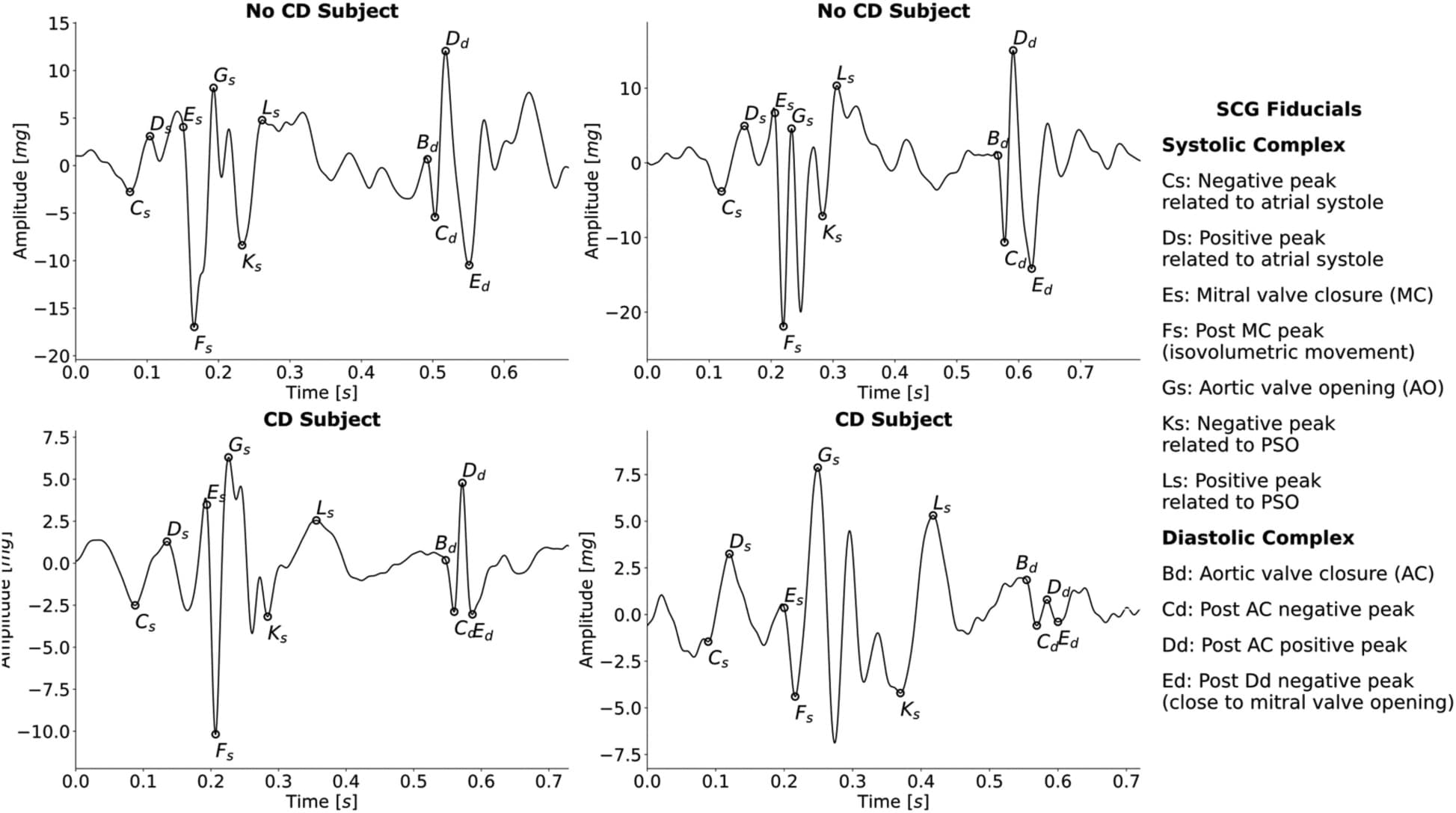 An algorithm for the automatic detection of 11 fiducial points in SCG using a U-Net and simple postprocessing methods was developed and tested in subjects with and without CD, with excellent performance.