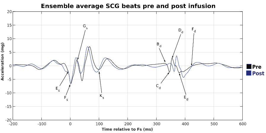 SCG showed significant differences before and after changes in pre-load induced by infusion of isotonic saline. SCG were able to detect significant differences in amplitudes Dd, Ed, and Ls and most of the time intervals.