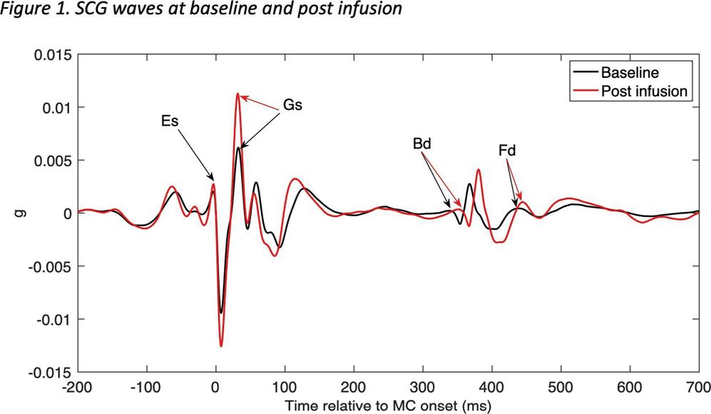 In the whole group, acute saline infusion shortened the IVRT (Bd-Fd) from 91.0±15.3 ms to 82.7±15.3 ms (p=0.004) and prolonged the ET (Gs-Bd) from 329.4±35 ms to 343.4±33 ms (p<0.001).